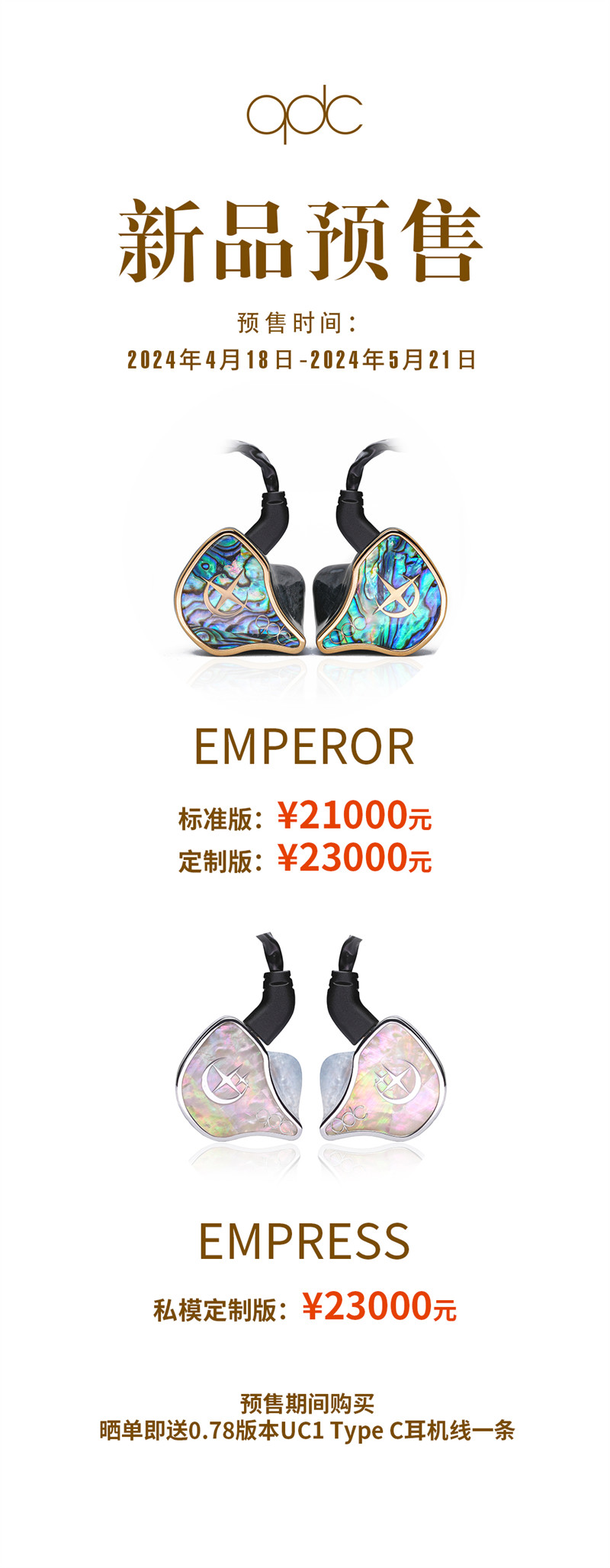 即日起,Emperor、Empress线上线下同步开启预售!预售期间购买,晒单即送价值580元的0.78版本UC1 Type C耳机线一条。(*晒单详情请在qdc耳机公众号输入“晒单”查看,若退货须将赠品一并退回)